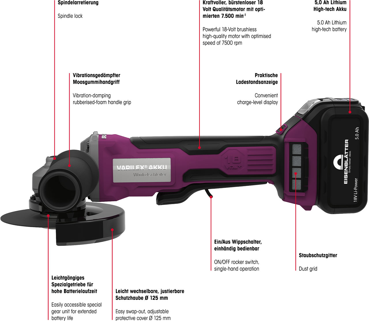 - VARILEX® AKKU 18V - Brushless, compact and extremely powerful battery powered angle grinder with the best high-tech components of market-leading manufacturers: JOHNSON ELECTRIC motor 18 volts and SAMSUNG 5.0 Ah Li-Ion batteries, constant rotational speed of 7,500 min-1