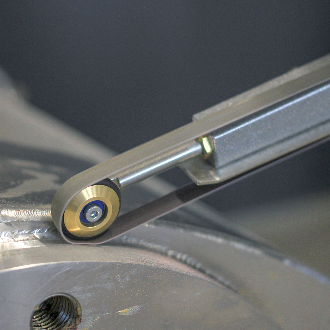 • For grinding and polishing belts between 5 and 9 mm width. Belt replacement in seconds. Quick-change brass contact wheel with high-quality needle bearings, and rubberised running surfaces.