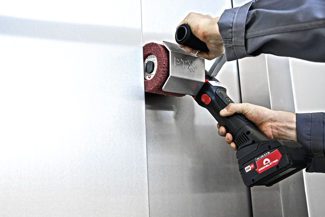 • Balanced, straight-line control without support rollers. This allows the tool to be freely adjusted (oscillation effect), ensuring highly decorative surfaces in satin and matt finish and industrial grinding without shadows or transitions.