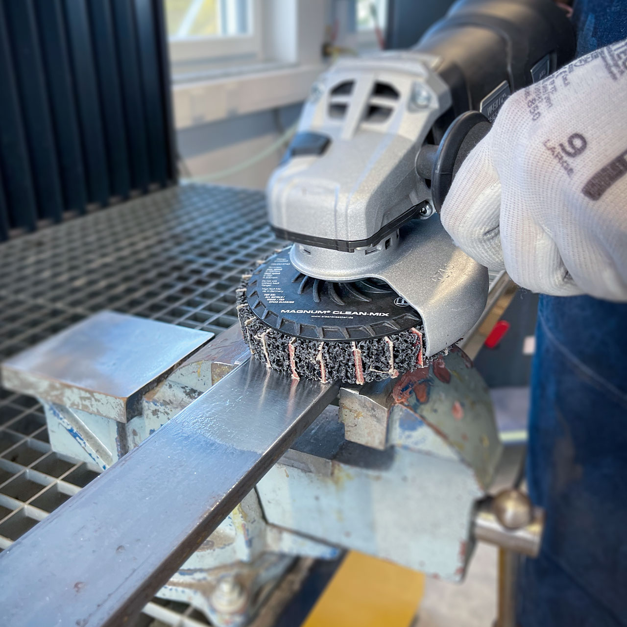 Cleaning discs for quick and thorough descaling, derusting and deburring. With intermediate layers of abrasive flaps for a stronger cleaning effect than conventional cleaning discs in just one step. They are also ideal for removing zinc thickenings, drips and zinc spikes after galvanizing, and for roughening the surface for a subsequent powder coating. Due to the open, elastic fabric pores of the CLEAN material, the grinding wheel does not become clogged and achieves a "sandblasting effect" on metal.