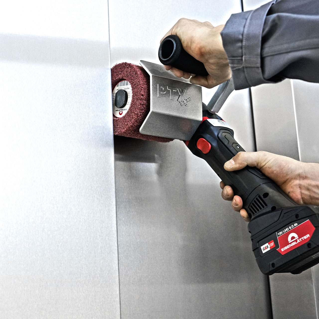 Metal application: Matting, satin finishing, fine grinding, application of fine longitudinal structures (finish) and removal of oxide layers, paint etc. as well as for matching "pre-ground" sheets and smoothing surfaces.