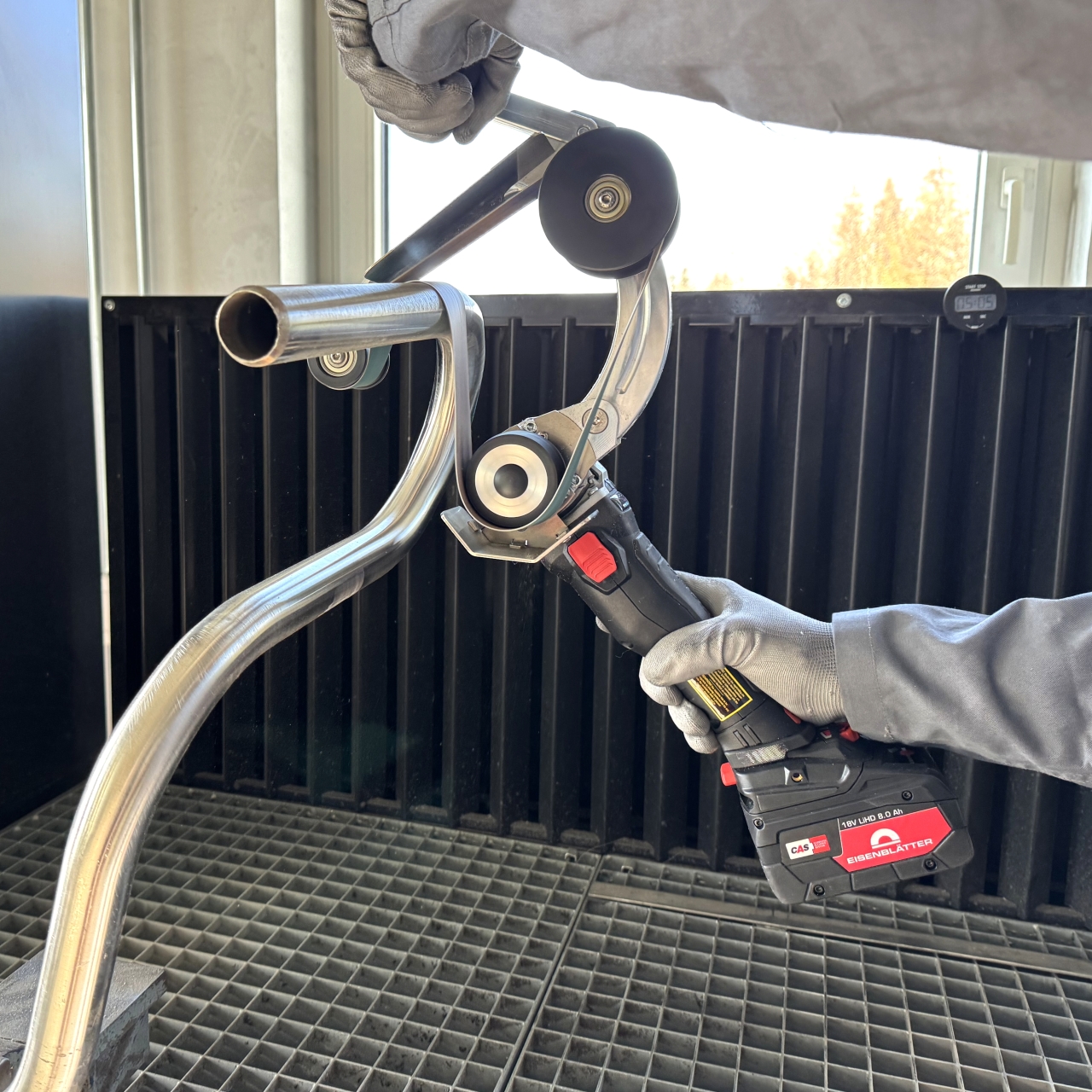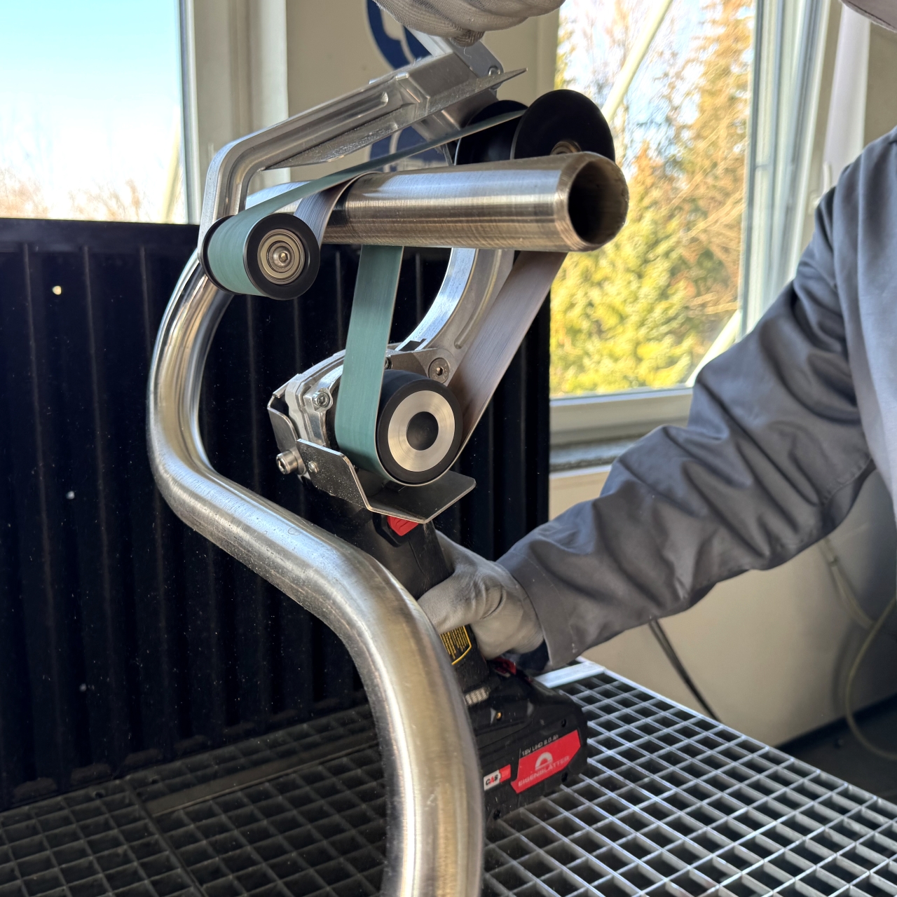 During use, the machine is "placed" on the round tube from above, which enables fatigue-free work for hours , as the weight of the machine rests on the workpiece.
