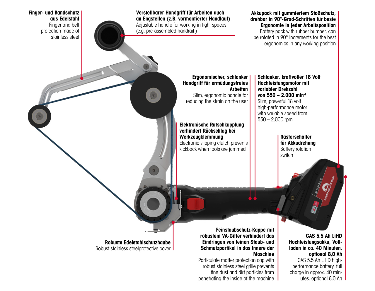 - Top-performance 5.5 Ah (optional 8.0 Ah) batteries, can be rotated to three positions by up to 270° for convenient handling.