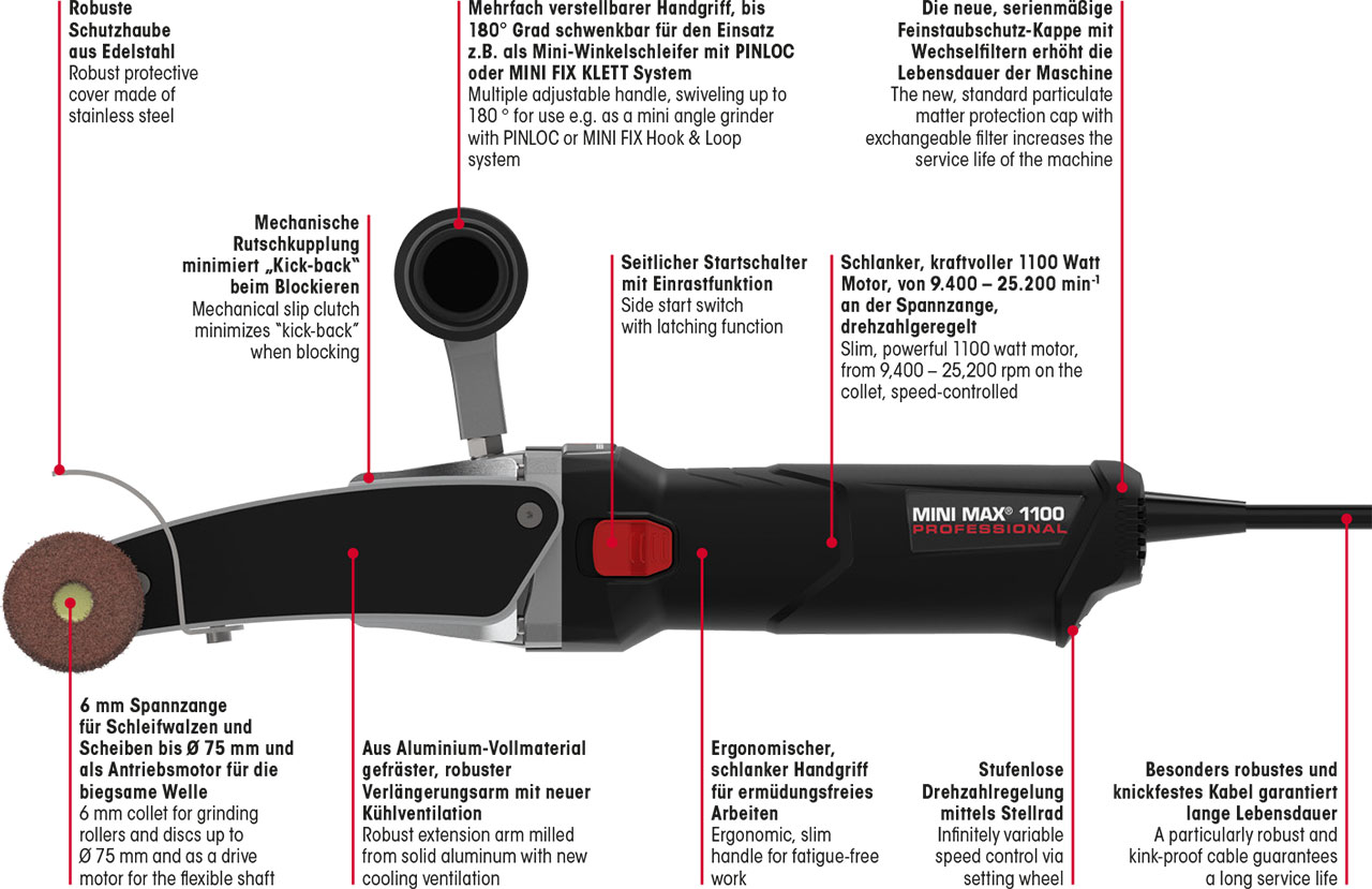 • The working temperature of the grinding arm and the gear head is massively reduced by a new type of air duct system, making the MINI MAX® 1100 ideally suited for continuous use.